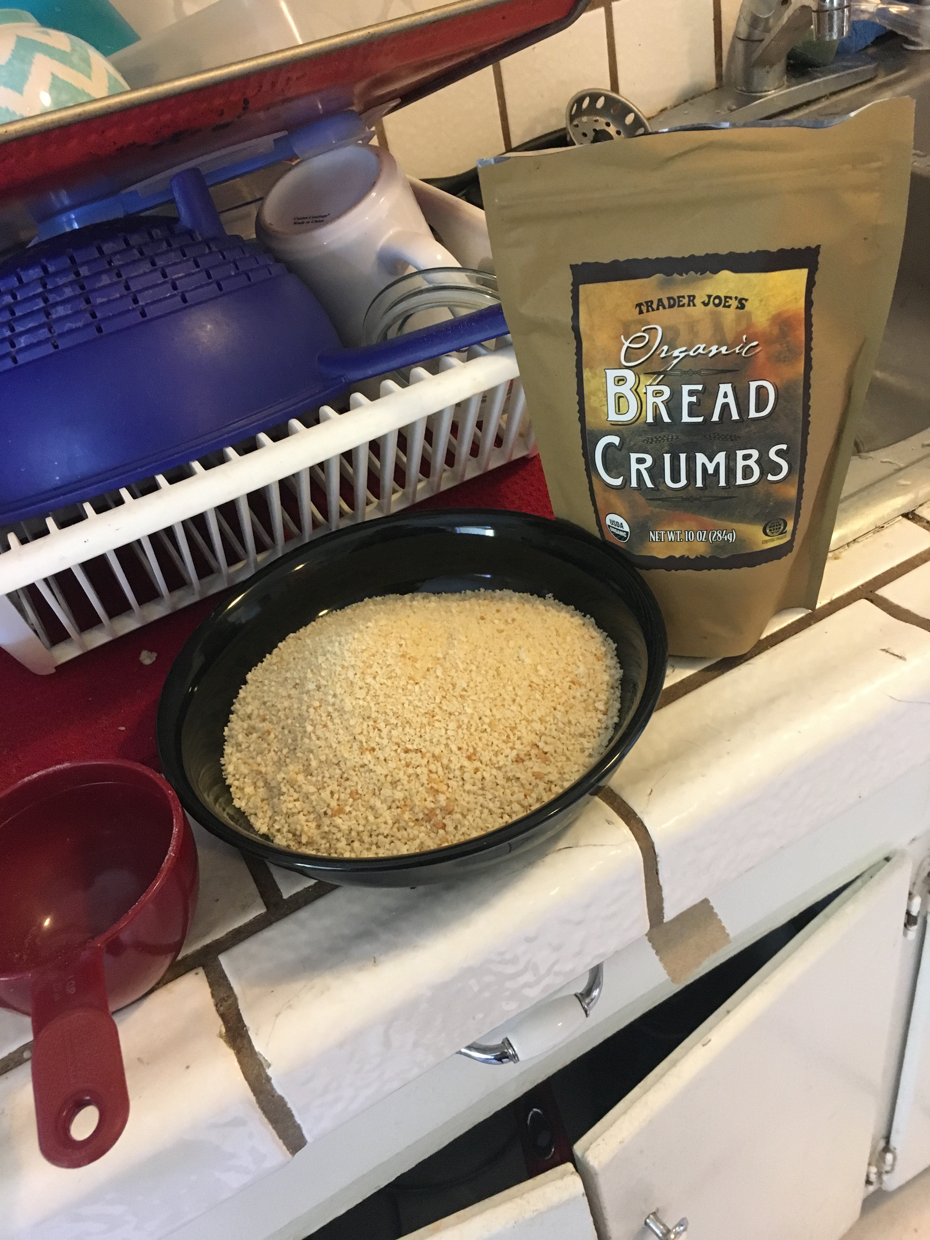 5. AND DIPPITY CHIP IT INTO THE BREAD CRUMBLES! Make sure it’s all covered up real good in the bread crumbs.