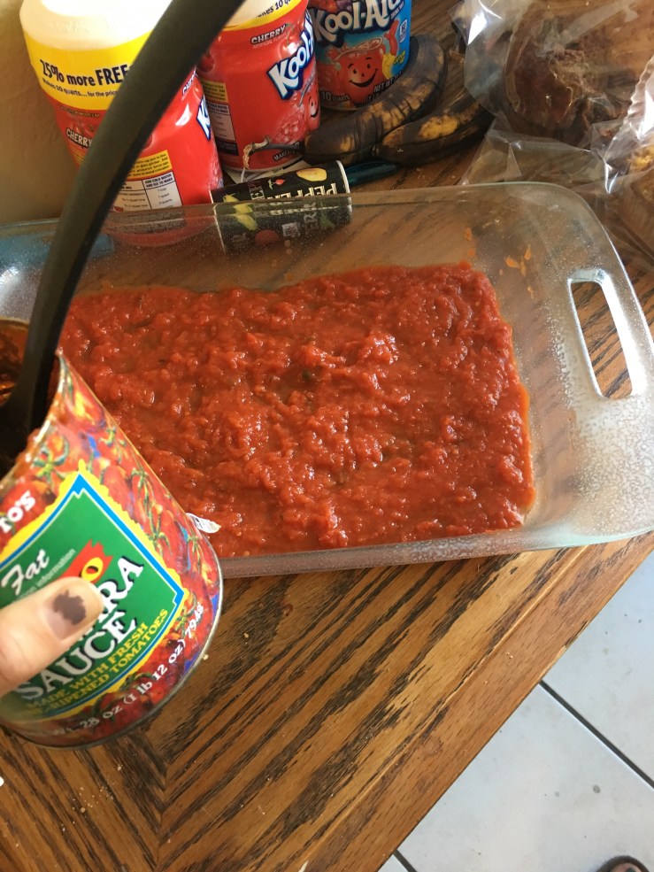 9.  While waiting, you can open up that jar of yum — aka, the Lowfat Tuscano Marinara Sauce — and slather your pan with a nice, thick layer of tomato happiness.